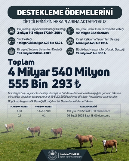 Büyükbaş Hayvancılık Desteği (Buzağı) ve Süt destekleme ödemeleri aşağıda yer alan takvime göre, diğer destekler tek parça olarak 19 Eylül 2025 tarihinde çiftçilerin hesaplarına aktarılacaktır.
