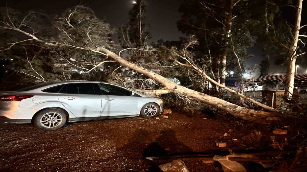 Hatay’ın İskenderun ilçesinde şiddetli fırtına etkisini hissettirirken üzerine ağaç devrilen bir araçta maddi hasar oluştu.