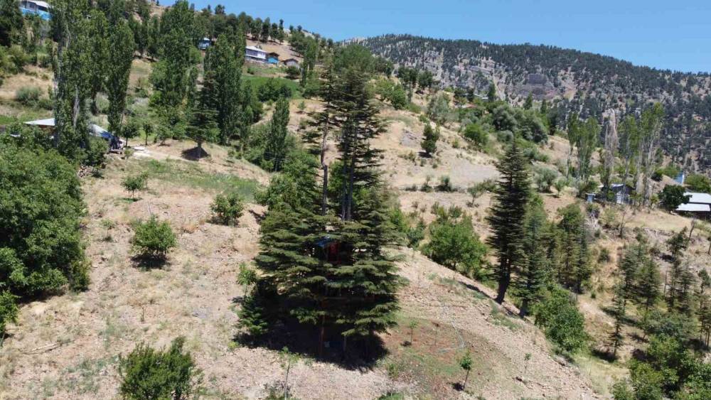 Sedir ağacı ve dalları arasına özenle hazırlanan iki katlı ev havadan görüntülendi.